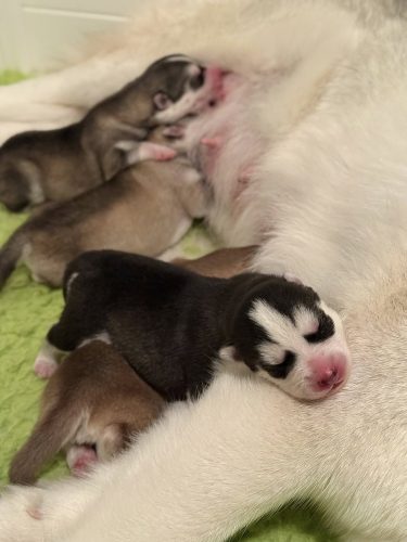 February 2024: On February 8, 2024 we welcomed our newest litter out of our beautiful Mystic (Ch. Wolvereen Enchanted SnowyDream NTD 2k9 T3 EQ5K) and our handsome Goosak (Ch. Yetieska’s Running With SnowyDream NTD 2k9 EQ5K). Mystic & Goose are the proud parents to 5 beautiful boys and sadly, one angel baby boy who despite our best efforts we could not revive. We have named the 5 boys after Game of Thrones characters – Jon Snow, Ghost, Drogon, Aemon & Bran! On February 16, 2024 we received our results back from the 6 DNA samples we sent in for SHPN1 & SPS1 and are thrilled that all 6 dogs have came back Clear/Clear for both mutations!!! With these 6, all 9 dogs in our breeding program are tested & clear: Axel, Goosak, Walker, Kindle, Iv, Stella, Mystic, Eb & Alice! <3