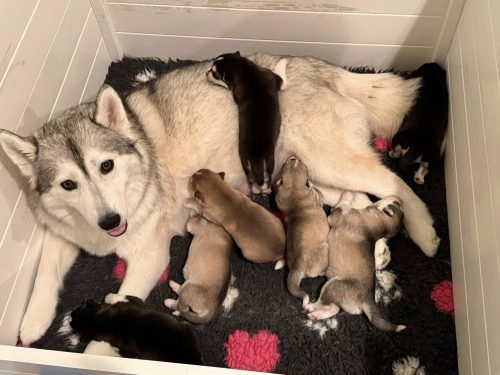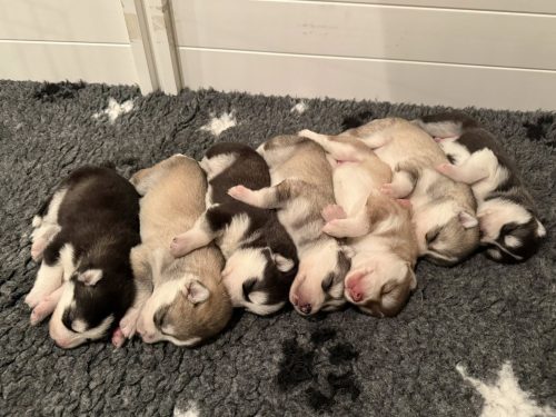 April 2022: On April 7th I hopped on a plane to fly to Cranbrook BC and pick up our newest addition! We are extremely excited to introduce ‘Goosak’ Yetieska’s Running With SnowyDream <3 We have been wanting to add a working line male to the pack for quite some time and when we saw this boy become available we had to jump on the opportunity. Goose is from an amazing breeder in South Dakota and has an exquisite pedigree! Huge thank you to Laurissa & Stan of Yetieska Siberians for this wonderful boy – we love him so much already! Also a HUGE thank you goes out to Margie of Kuvuk Siberians for driving to Montana to meet Stan and pick up Goose and looking after him for a few days before I could fly in and grab him, we are so incredibly grateful for you and all your help! (Photos by Yetieska Siberians) – Photos of his sire Knight & dam Trixie at the end. Easter weekend 2022 we were blessed with 10 beautiful puppies (6 boys & 4 girls). Mamas and babies are doing amazing <3