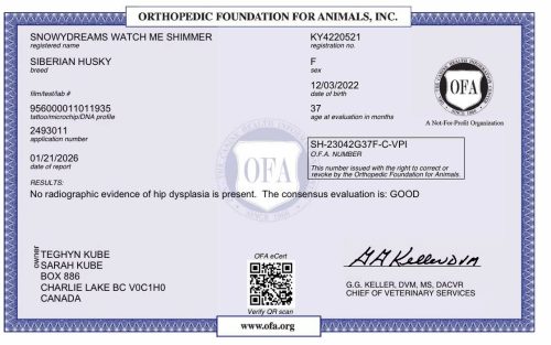 August 2018: Yay! We got ‘Zara’ Kamchatka Dazzle Them ‘s Hip score back in the mail and are VERY happy to say she was OFA rated as ‘Excellent’!! On August 18, 2018 we said hello to the newest ‘pack’ members as we were blessed with a lovely litter of 6 babies out of our gorgeous girl ‘Eden’ BIS/RBIS/MBBIS Can GCh. SnowyDreams Heaven Sent CGN and sired by the handsome ‘Regal’ BISS Am GCHG/Can GCh. Snocrest’s It’s Good To Be Bad AOM. Eden & Regal are the proud parents of 2 girls (1 grey & white and 1 red & white) and 4 boys (all grey & white). We called this litter the ‘Fate’ litter, as it seemed appropriate with this special opportunity to have Regal here. The girls are SnowyDreams When Stars Align & SnowyDreams Meant To Be and the boys are SnowyDreams What Lies Ahead, SnowyDreams Twisted Fate, SnowyDreams What’re The Odds & Snocrest’s Good As Gold. We are pleased with this special litter and excited to see what their future holds!