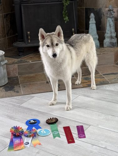 January 2024: A great way to start the year – our boy Goosak (Ch. Yetieska’s Running With SnowyDream NTD 2k9 EQ5K) had his Hip xray done and was rated ‘Good’ with OFA. <3 Goose is now fully health tested (Eyes Clear, Hips Good & SHPN1/SPS1 Clear (by parentage). Yay! Goose & Axel achieved their T3 (Triple Threat) titles this month as well!!