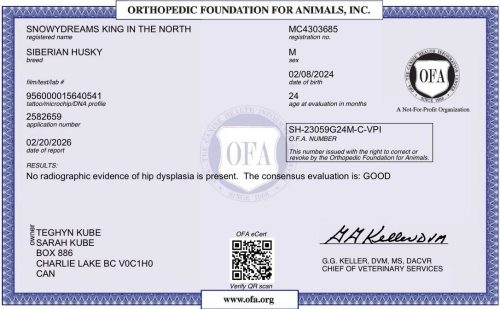 August 2018: Yay! We got ‘Zara’ Kamchatka Dazzle Them ‘s Hip score back in the mail and are VERY happy to say she was OFA rated as ‘Excellent’!! On August 18, 2018 we said hello to the newest ‘pack’ members as we were blessed with a lovely litter of 6 babies out of our gorgeous girl ‘Eden’ BIS/RBIS/MBBIS Can GCh. SnowyDreams Heaven Sent CGN and sired by the handsome ‘Regal’ BISS Am GCHG/Can GCh. Snocrest’s It’s Good To Be Bad AOM. Eden & Regal are the proud parents of 2 girls (1 grey & white and 1 red & white) and 4 boys (all grey & white). We called this litter the ‘Fate’ litter, as it seemed appropriate with this special opportunity to have Regal here. The girls are SnowyDreams When Stars Align & SnowyDreams Meant To Be and the boys are SnowyDreams What Lies Ahead, SnowyDreams Twisted Fate, SnowyDreams What’re The Odds & Snocrest’s Good As Gold. We are pleased with this special litter and excited to see what their future holds!
